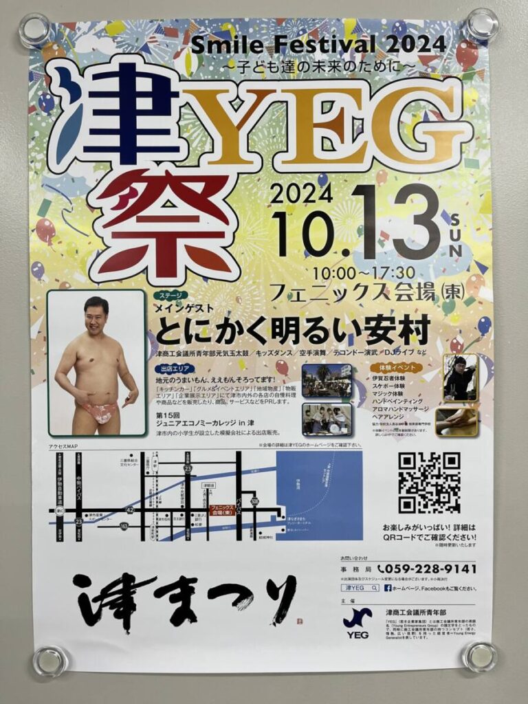 一日船長 稲村亜美さん、とにかく明るい安村さんもくる-津まつり 公開日:2024/10/04 更新日:2024/10/04 津まつりまで、あと1週間。和船山車の船長 稲村亜美さん、とにかく明るい安村がいよいよやってくる!!津まつりまでいよいよ残すところあと1週間となりました。津まつりでは、関係団体でいろいろなポスターをつくっていますが、当観光協会では4つのポスターを集めることができましたので、皆様にも見ていただこうと思って掲載してみました。津市を代表する郷土芸能の数々、安濃津よさこいの迫力ある演舞、まちにはたくさんの屋台も出て、見どころ満載の津まつりです。10月13日(日)には、一日船長としてタレントの稲村亜美さん、フェニックス会場(東)には「とにかく明るい安村」がやってきます。皆さん、お誘いあわせの上ご来場ください!〇一日船長 稲村亜美さんの出演情報 日時:令和6年10月13日(日) 一日船長櫂引き渡し式 13時55分から(裁判所前会場) 一日船長トークショー 15時~(津中央郵便局前会場) 〇とにかく明るい安村さんの出演情報 日時:令和6年10月13日(日) 1回目 11時15分~12時 5分 2回目 13時45分~16時35分。 場所:フェニックス会場(東) ※津まつり公式サイトは、こちら※安濃津よさこい公式サイトは、こちら※津YEGの公式サイトは、こちら※津JC公式サイトは、こちら