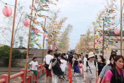 観音橋の上から、願い事の短冊を付けた笹飾りを岩田川へ流そう!