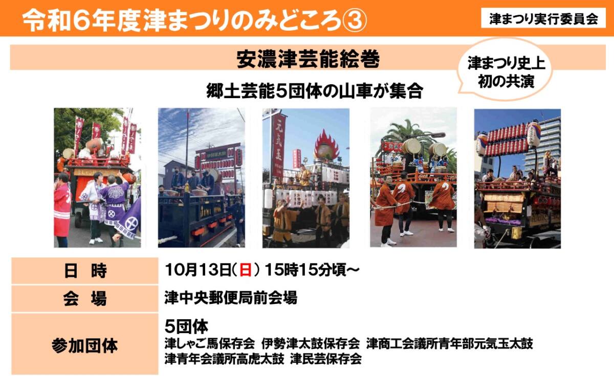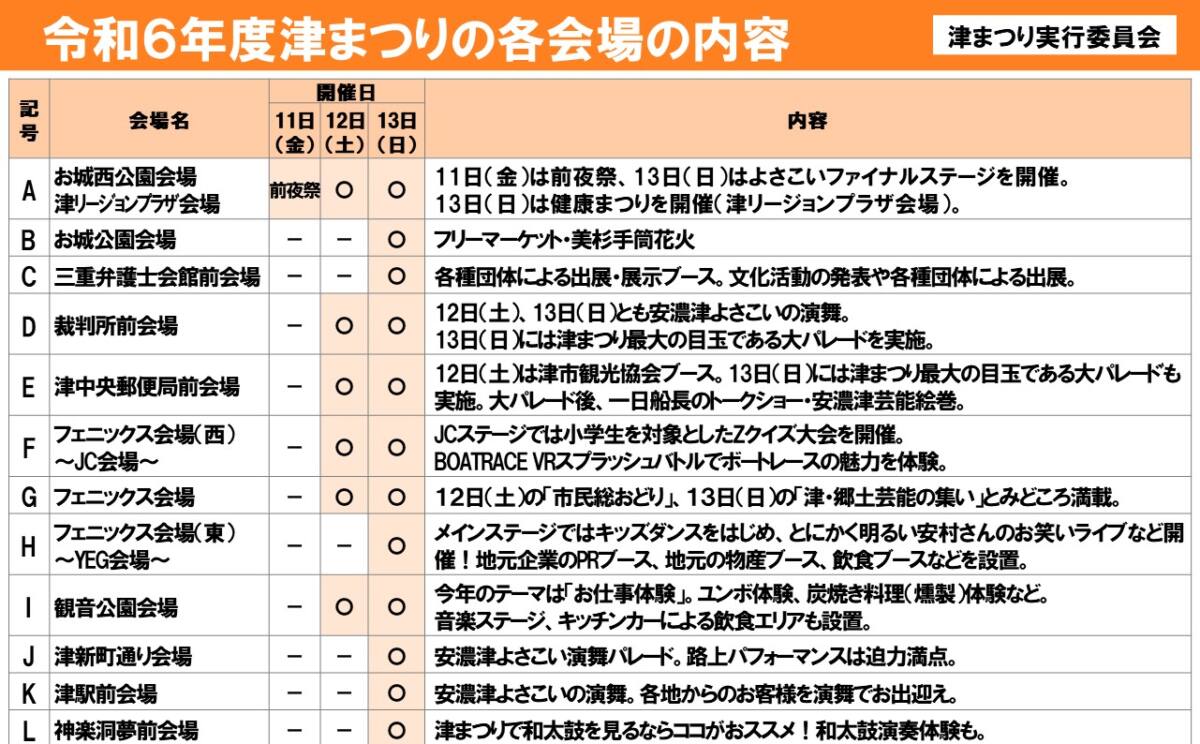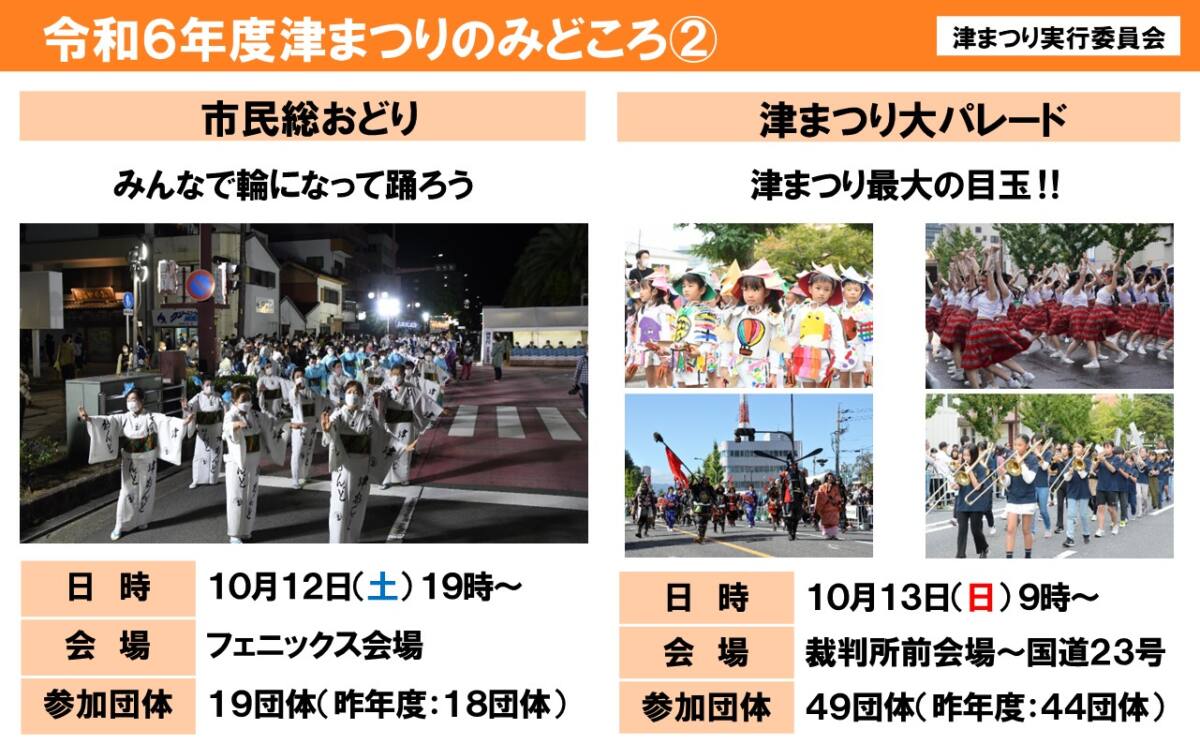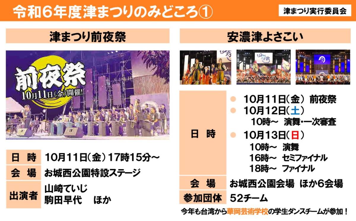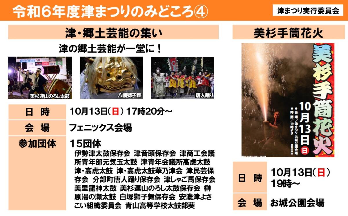 〇イベント系の見どころ(大パレード、お城西公園特設ステージ、安濃津芸能絵巻、津・郷土芸能の集い、とにかく明るい安村さんのお笑いライブ、美杉手筒花火)