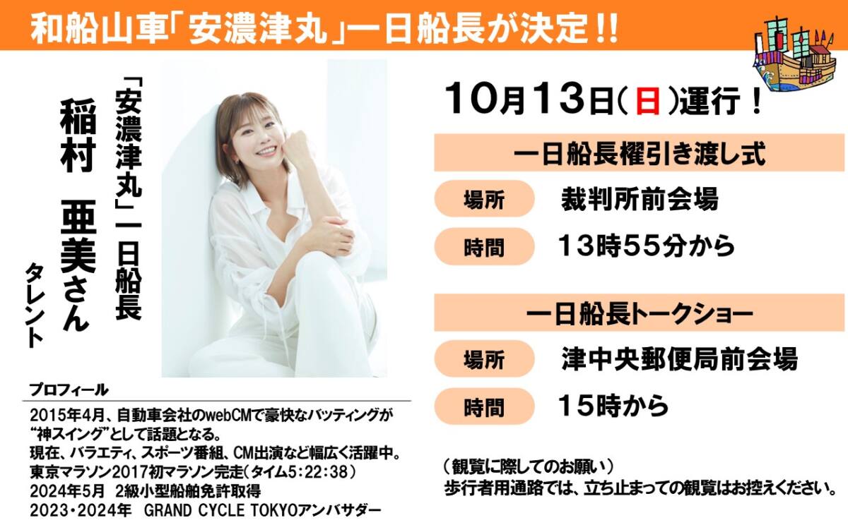 いつもお馴染みのタレントさんや俳優さんがきてくれるので、これを楽しみにしている方も多いと思います。今年の一日船長は、あの神スイングで話題になった、稲村亜美さんです!! 和船山車の上の稲村さんに早く会いたいですね!
