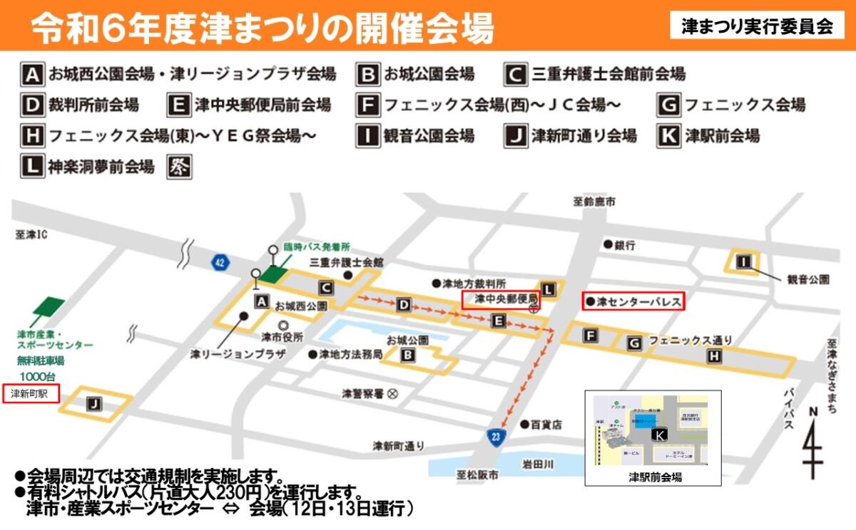 ・近鉄津新町駅 津新町駅バス乗場①から「三重会館前バス停」(下図 津中央郵便局前)まで10分程度です。なお、下図「J津新町会場」までは徒歩5分程度。メインステージのある「Aお城西公園会場」までは徒歩15分程度。なので、津新町駅からは、バスで行くよりも、徒歩で会場をめぐって行くという楽しみ方もありです。