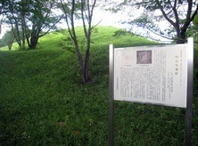 さらに、周囲には計画的に配置された方形の陪 塚(ばいちょう)5基があります。1号陪塚は、ほとんど壊れていますが、発見当初の規模は、一辺11.7m、高さ1.8mを測り、円筒埴輪や葺石が認めら れます。現在は、一辺8.0m、高さ0.7mの規模となっています。2号陪塚は、「小塚(こづか)」と呼ばれ、現存している陪塚の中では最大で一辺 22.0m、高さ2.0mを測り、葺石・円筒埴輪列が確認されています。また、須恵器片が採集されています。3号陪塚は、痕跡のみで墳丘規模は不明です が、発見当初は、1.0m程度封土が残存していたようで、円筒埴輪、蓋形埴輪片が採集されています。4号陪塚は、周辺を開墾されているため、墳丘の形状は 不明瞭ですが、一辺16.0m、高さ1.5mを測ります。5号陪塚も開墾などで墳丘の形状は不明瞭ですが、一辺15.1m、高さ0.7mを測り、埴輪片等 が採集されています。なお、主墳及び陪塚の内部主体・副葬品などは不明です。明合古墳群の形成された時期は、採集されている遺物から5世紀前半~6世紀初 めと推定されます。