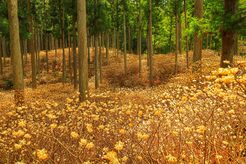 ミツマタの群生地は、美杉町石名原にあります。昭和30年頃に山林の多目的利用のため植えられ、その後、何回かの山林の間伐作業が行われてきましたが、平成24年度に通常より強度の間伐が実施されたところ、それまで、一部しか見られなかったミツマタが一面に広がりを見せ、現在に至っています。群生している面積は約1.5ha(15,000?)です。森の樹齢は、約70年です。