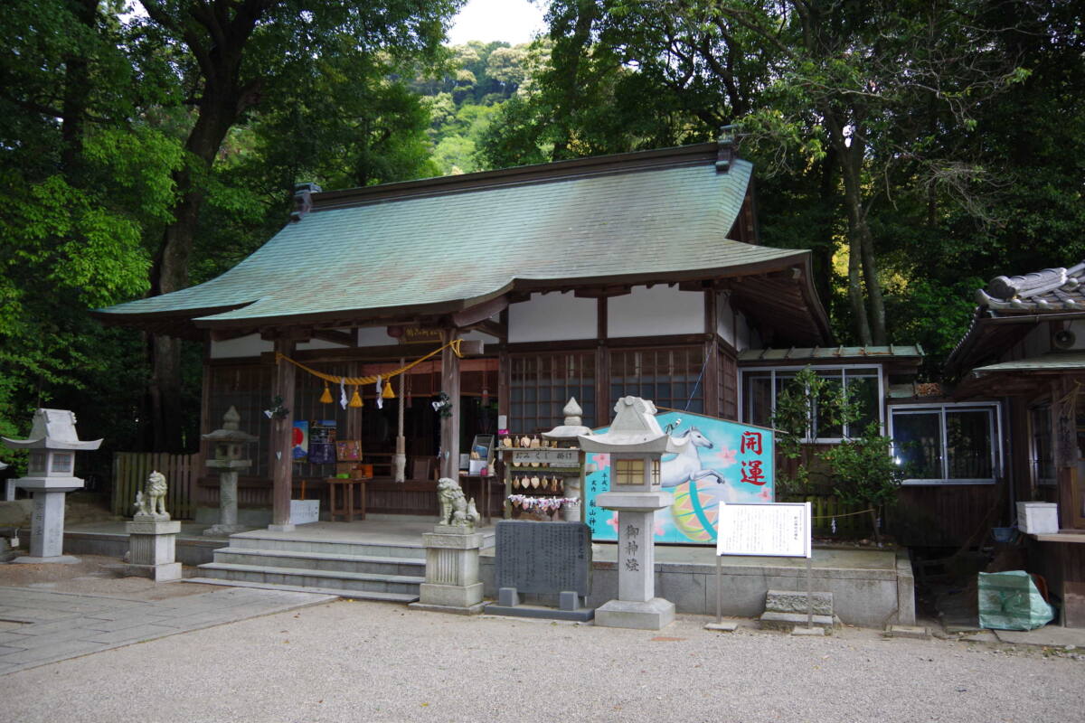 この神社は境内の裏手にある湯之瀬川の北岸にそびえる射山(貝石山)を御神体とし、今も山腹八合目に御社跡が残っています。