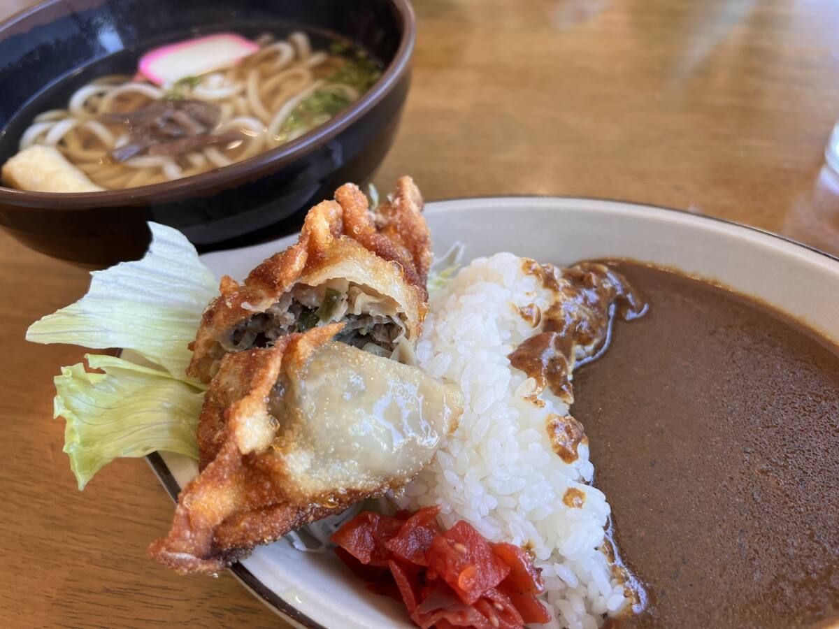 落合の郷から車で3分の場所にある、「錫杖湖水荘」ではご当地グルメである津ぎょうざのダムカレーを食べることもできます。とても美味しいです。
