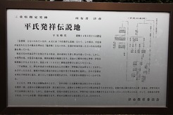 津市の郊外、産品の地は平清盛の父忠盛が生まれた所といわれ、忠盛の胞衣塚や産湯を使ったという産湯池があって、伊勢平氏発祥地の伝説地として県指定史跡となっている。