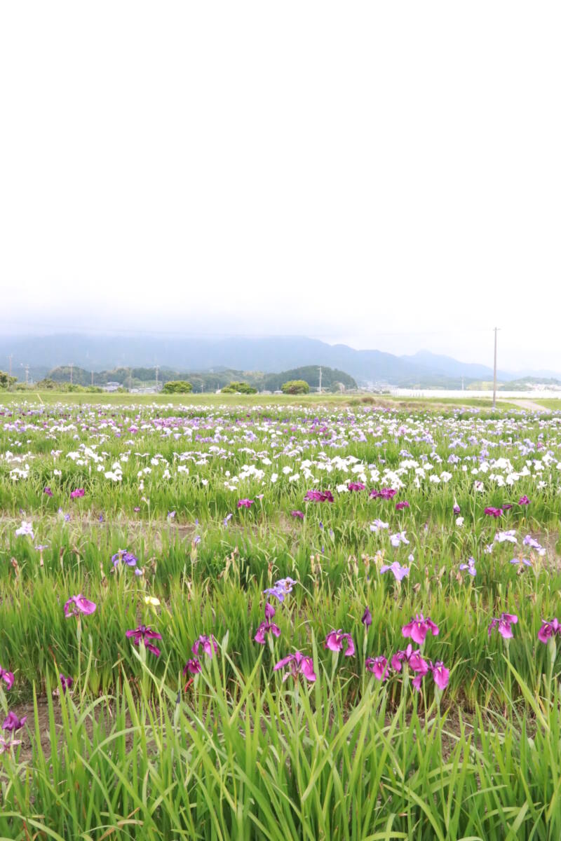 伊勢花しょうぶ園写真6月中旬、梅雨のうっとうしさをふきとばすかのように色鮮やかに咲く花しょうぶは、安濃町連部地区を中心に栽培され、約2ヘクタールの水田に10万株以上が植えられています。