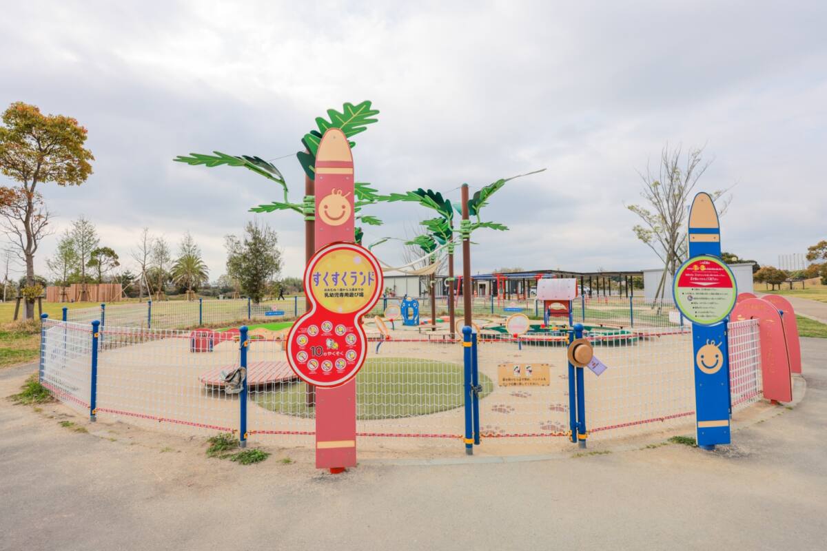 公園の端のあそび広場もあり、幼児向けの動物型のブランコや、回廊型のアスレチック型遊具が3つございます。